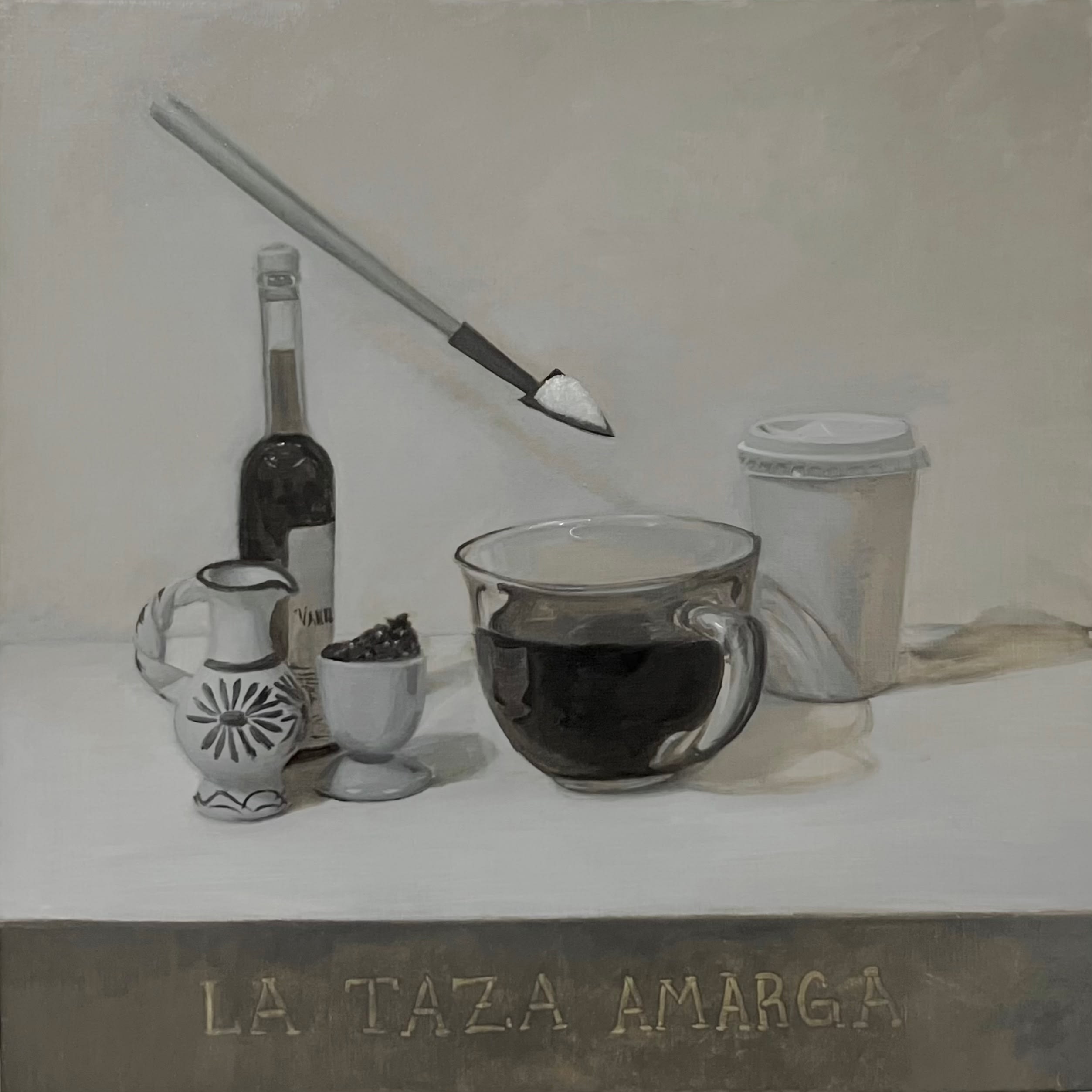 “Neutral Levitation IV nods to the interconnected journey of coffee—from its agricultural roots to its commodification—while highlighting the labor and natural resources behind this global industry. Through monochromatic tones and carefully chosen objects, I explore the tension between tradition and modernity, personal ritual and global economics. By incorporating symbols like soil, sugar, and a floating miniature shovel, I bridge the intimate act of drinking coffee with the broader socio-economic and environmental challenges tied to its production. The floating shovel simultaneously grounds and elevates the narrative of labor, cultivation, and consumption. The text ‘La Taza Amarga’ underscores the bittersweet reality of coffee cultivation, where the enjoyment of this daily ritual is inextricably linked to the hardships tied to its production.”